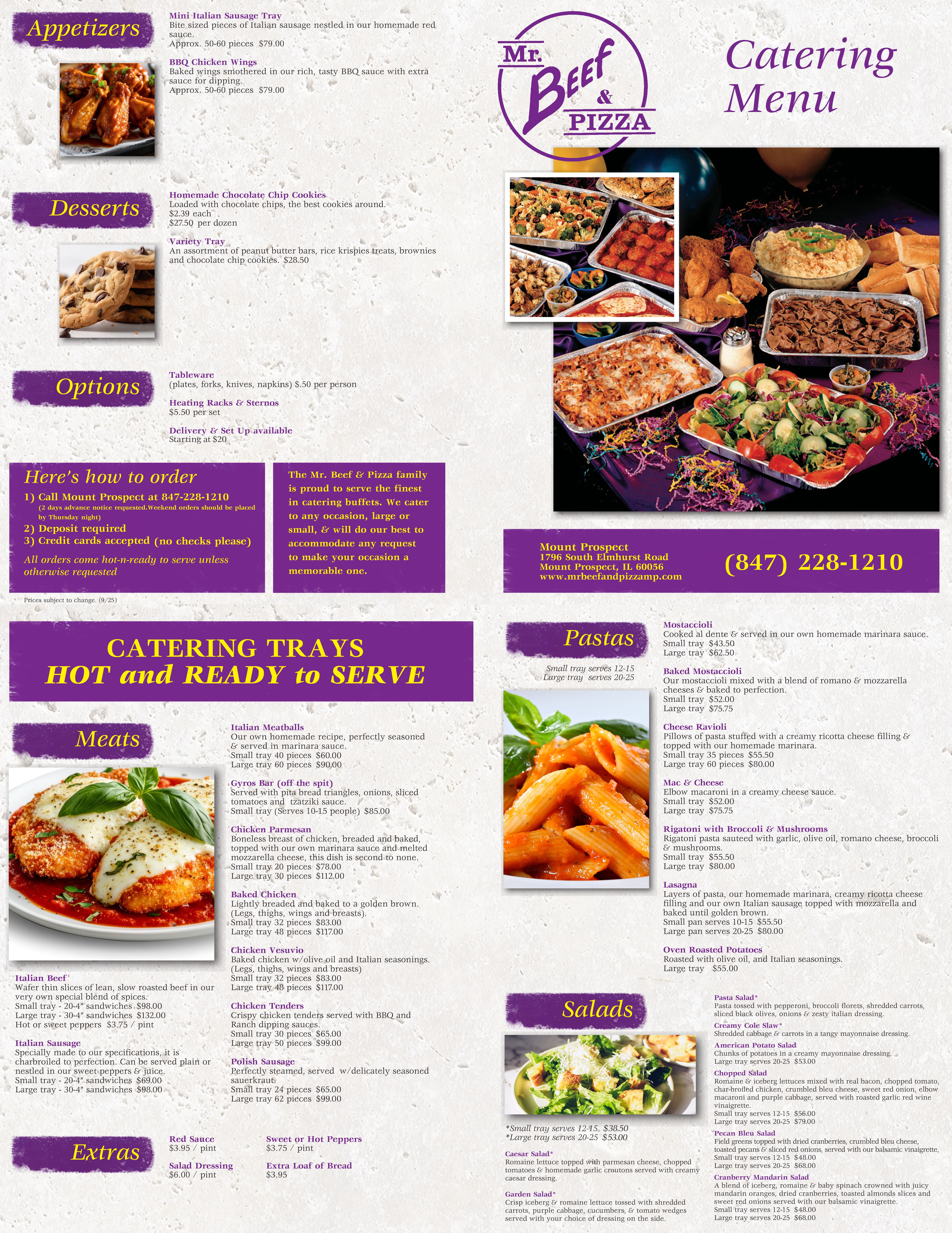 1) Call Mr. Beef and Pizza in Mount Prospect at 847-228-1210.